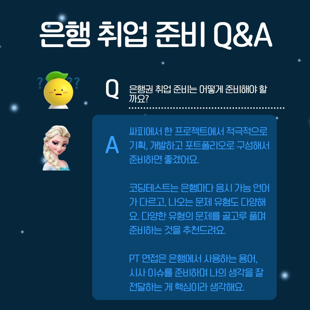 멘토링 간담회 당시 멘토님이 프로젝트 준비하는 과정에 대한 답변을 들으며 엘사 멘토님은 성실하고 꼼꼼한 분이라는 것을 알 수 있었습니다. 그래서 프로젝트 경험이 충분하셨기 때문에 특별한 은행 관련 경험이 없었음에도 합격한 것 같습니다. 물론 은행 특화 프로젝트나 자신이 가고 싶은 직무와 관련된 경험을 준비할 수 있고 있다면 적는 게 좋다고 하셨지만 없더라도 합격을 좌지우지 할 요소는 아닌 것 같다고 해주셨으니 참고하시면 좋겠습니다.